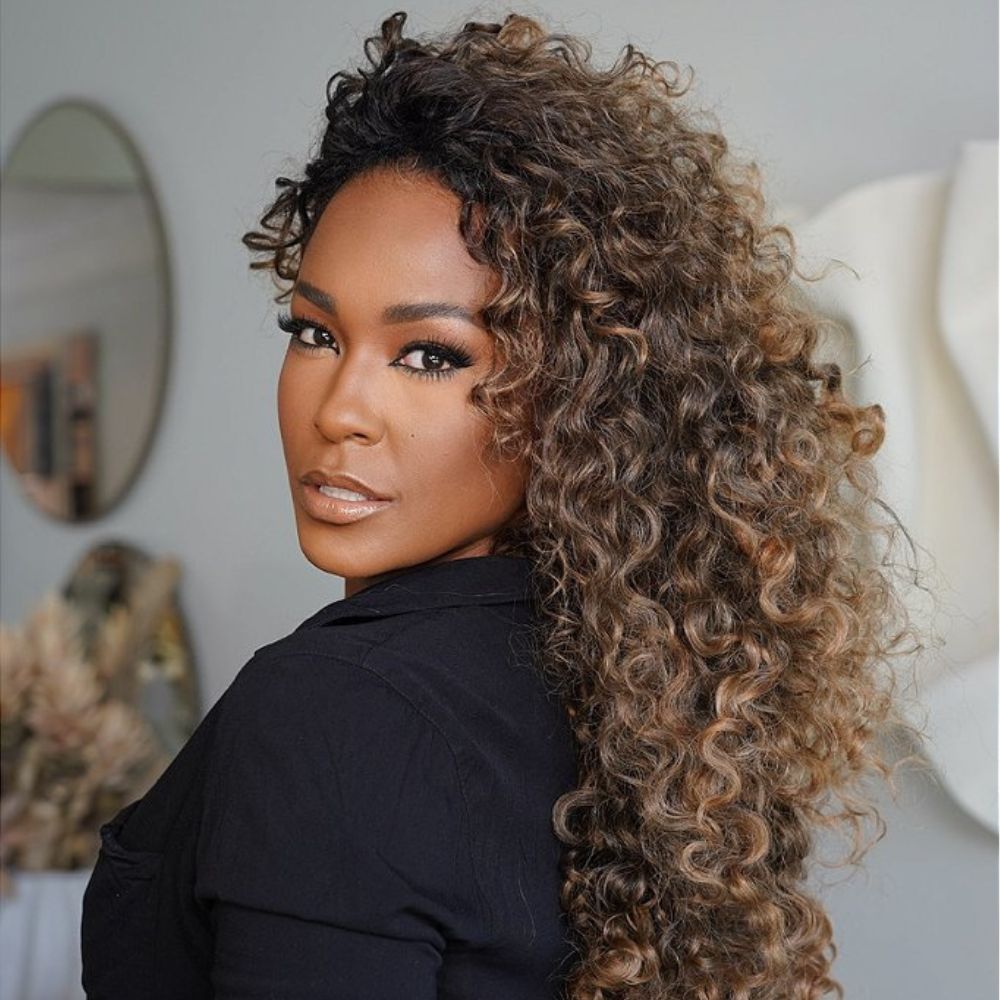 • Glueless Honey Brown Mix Blonde Highlights Curly 5x5 Lace Closure Wig