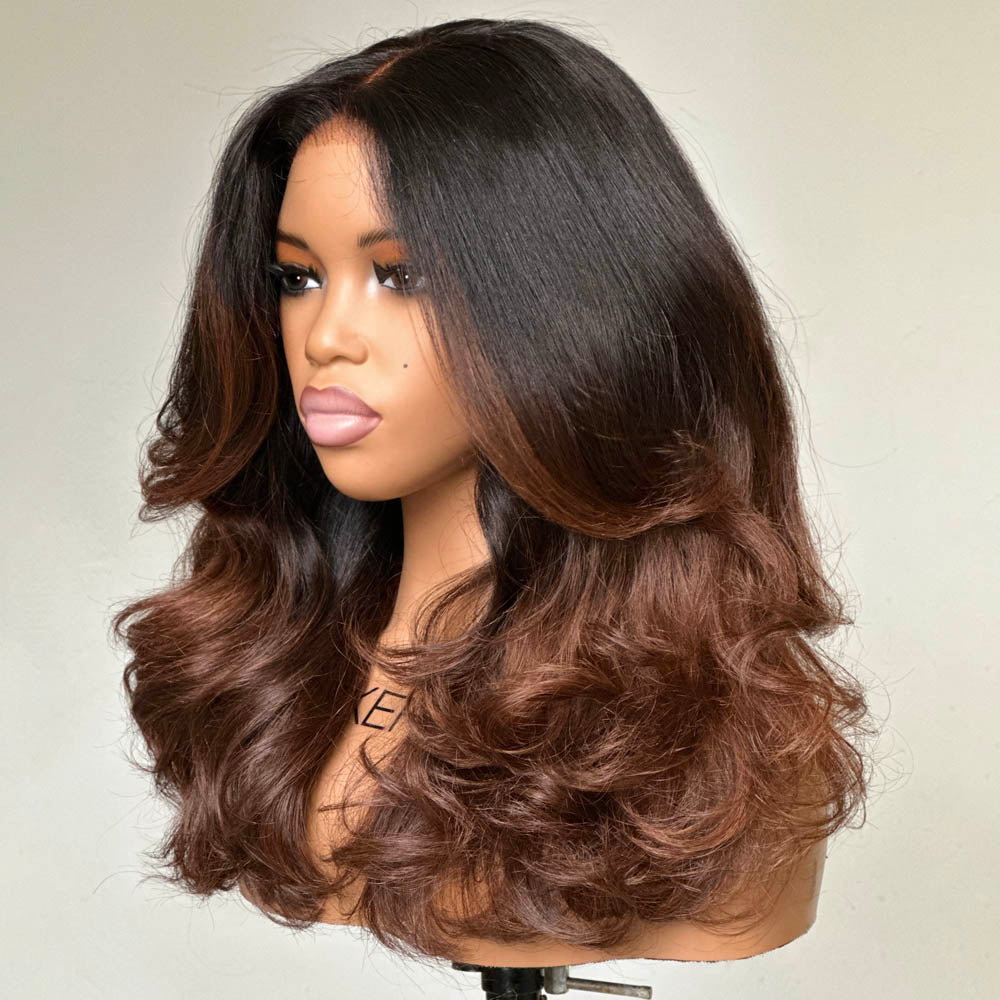 • Put on & Go Ombre Brown Layered Wavy Glueless 5x5 Lace Closure Wig