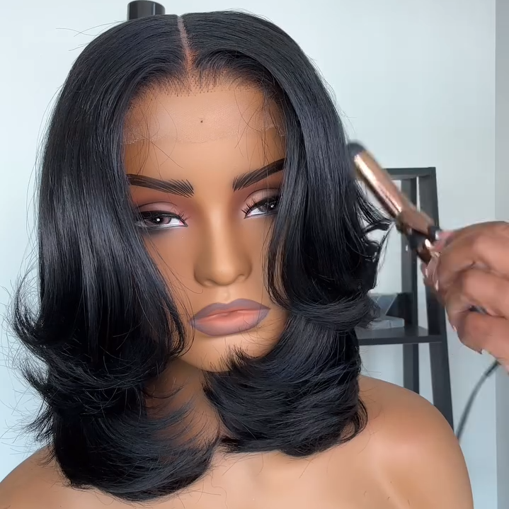 Fluffy Natural Black Layered Bob 5x5 Lace Closure Wig