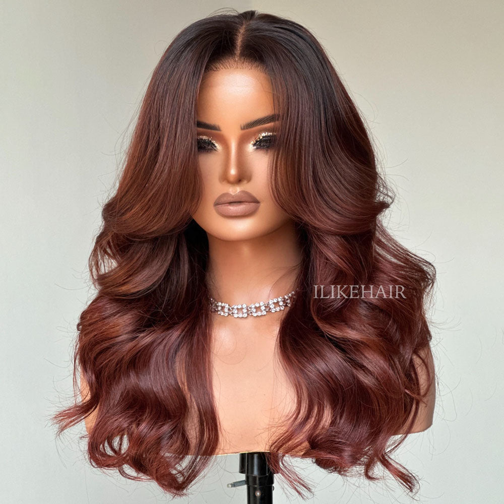 Long Layers Ombre Reddish Brown Body Wave Lace Closure Wig