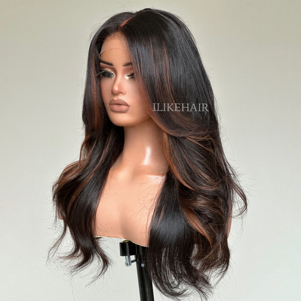 • Auburn Brown Highlights Layered Cut Wavy Lace Closure Wig
