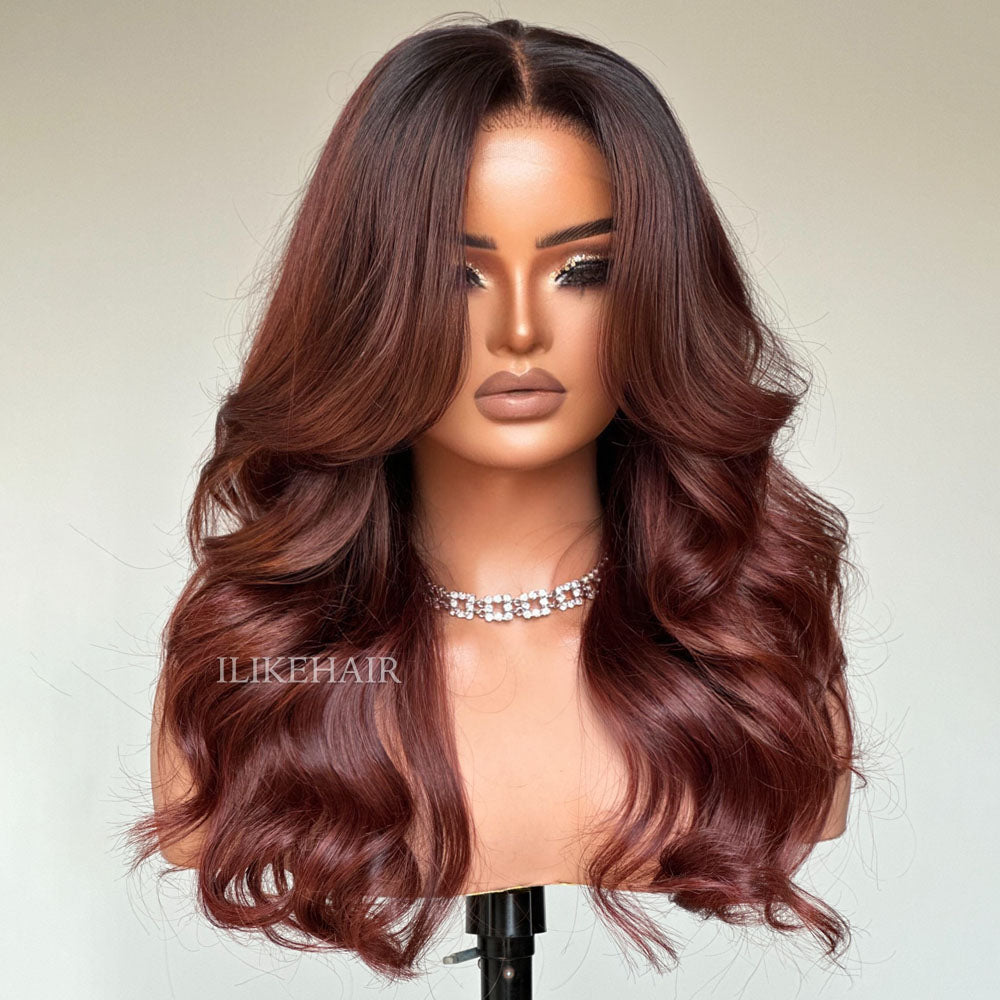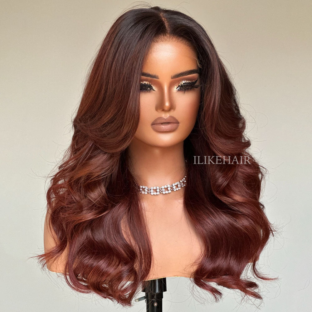 • Long Layers Ombre Reddish Brown Body Wave Lace Closure Wig