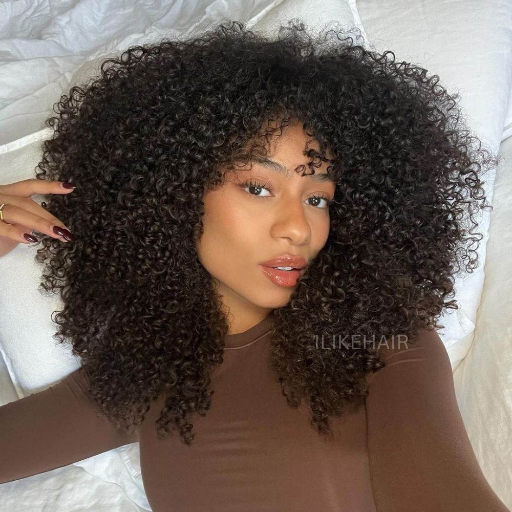 • Natural Afro Kinky Curly With Bangs 5x5 Lace Closure Wig