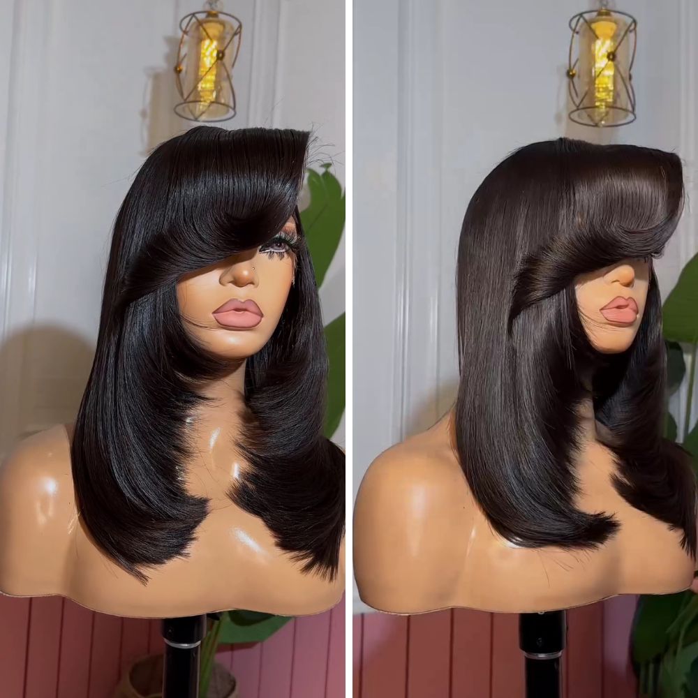 • Trendy Layered Cut Wavy Lace Closure Wig With Side Bangs